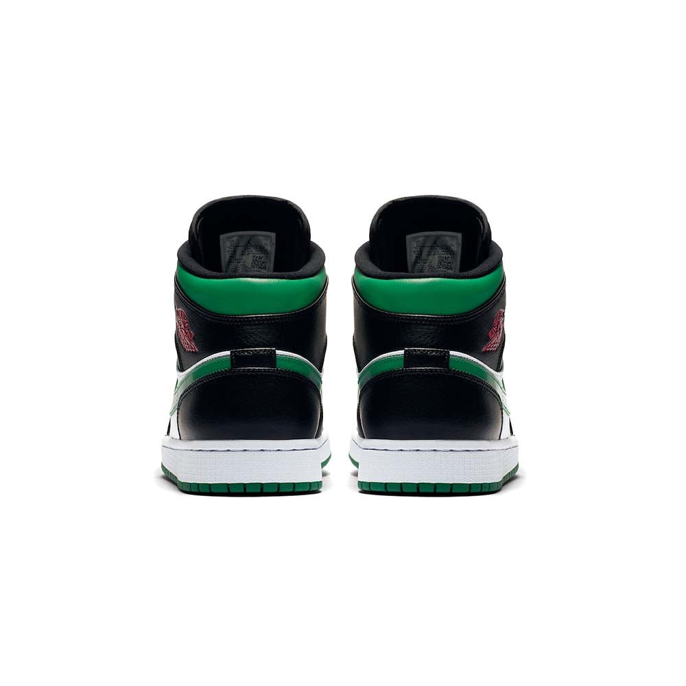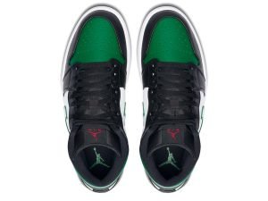 The Air Jordan 1 Mid “Green Toe” is part of Jordan Brand’s continuous efforts of creating ultra-wearable colorways of Michael Jordan’s first signature shoe in mid-top form. Premium leather highlights the upper as black leather overlays on the forefoot and eyelets is contrasted by a white leather base. Jordan Brand references classic Air Jordan 1 styling by equipping the shoe with a perforated green leather toe that contrasts the forefoot. Vibrant red Wings branding on the black collar finishes off the styling.