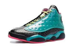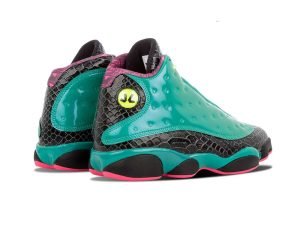 Designed by patient John Charles, the Air Jordan 13 gets its most distinct makeover ever. The bold design features a patent leather upper in snakeskin-embossed black and smooth green with details including his soccer number, initials, and “Crohn’s” written below the clear portions of the outsole, symbolic of John’s fight to stomp out the disease he suffers from.