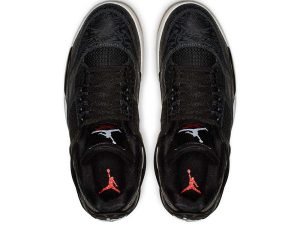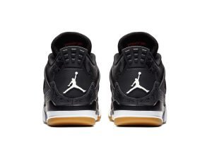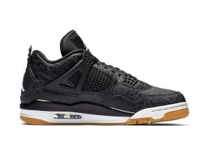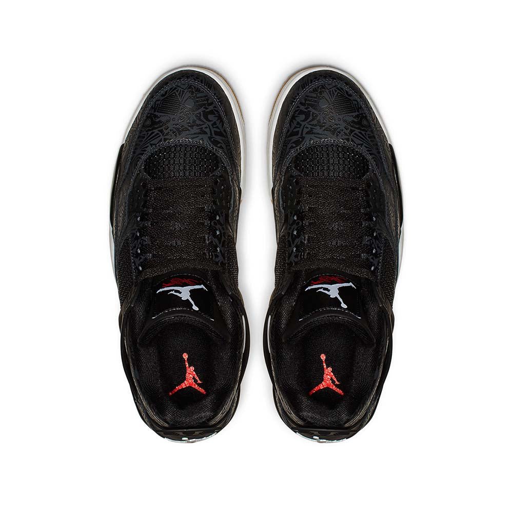The Air Jordan 4 Black Laser is a special edition of the iconic Michael Jordan signature shoe featuring a classic laser graphic by Jordan Brand. Originally appearing on the Air Jordan 20 and an older release of the Air Jordan 4, the Laser pattern features an intricate mix of graphics inspired by Jordans career and the history of Jordan Brand. It appears on this 2019 release as a glossy tonal print on the black leather upper. The all-black upper is complemented with a white midsole and gum rubber outsole. Hits of red appear on the Flight text on the tongue as well as the Jumpman on the outsole and insole. The Air Jordan 4 Black Laser released on January 19, 2019.