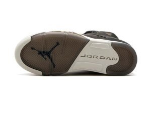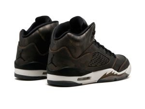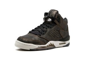 Celebrating the theme of flight, the Heiress collection features a series of colorways in camo details. The Air Jordan 5 Retro Premium GS ‘Heiress’ showcases a dark leather upper dressed in a camo print with Metallic Field highlights. The mid top also boasts a toggle lacing system, mesh side panels, a padded collar for added comfort, a Light Bone midsole, and a partially encapsulated Air unit.
