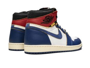 The Union x Air Jordan 1 “Storm Blue” is one of two special editions of Michael Jordan’s first signature shoe from the Los Angeles menswear boutique. The cut and paste theme of the collaboration by Union combines two original colorways of the Air Jordan 1 into one shoe. For the “Storm Blue” colorway, the design combines the body of the original white and blue version with the red and black ankle of the “Bred” colorway. The colorway has a vintage look with yellowed leather that has a distressed treatment around the ankle paneling. A “UN/LA” patch is added to each ankle to complete the unique construction.