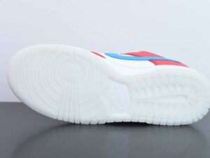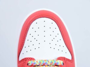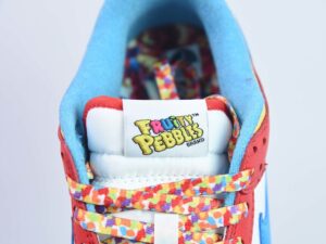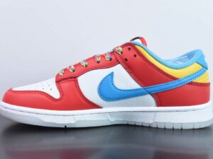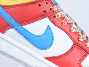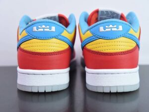 The Nike Dunk Low QS LeBron James Fruity Pebbles come in Habanero Red mixed with Laser Blue and White colorway.