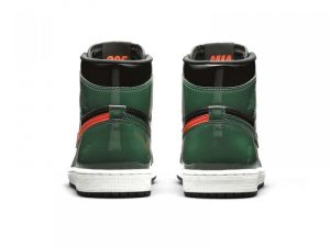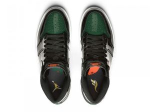 Jordan Brand teamed up with SoleFly to celebrate Art Basel Miami, the international art fair that takes place the first week of December every year. The SoleFly x Air Jordan 1 Retro High OG ‘Art Basel’ Friends & Family features a patent black leather upper with green leather overlays on the toe box, collar, and heel. The high top also boasts embossed Wings details, quilted tongue, and MIA and 305 lettering on the inside of the tongue. The shoe features alternating Swooshes, with a bright orange on the left lateral and right medial shoe, and green on the right lateral and left medial shoe.