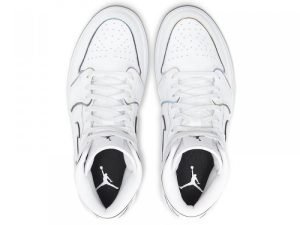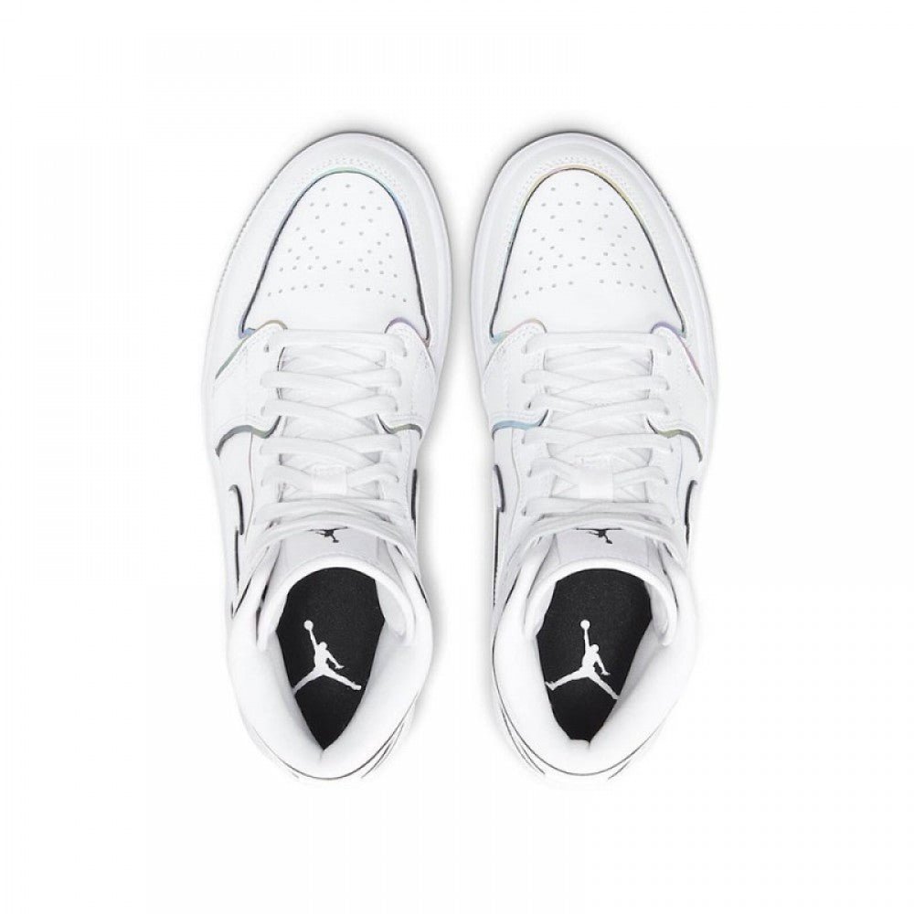 The Women’s Air Jordan 1 Mid “Iridescent Outline” is a women’s-exclusive edition of the mid-top Jordan 1 with a unique “outlined” construction. The upper is composed of a white leather base and features detailing in the form of a perforated toe, embossed tonal Wings logo on the collar and Swoosh on the mid-panel. Iridescent trimming is seen around each panel in a reflective material that changes color when hit with light. The rest of the women’s-exclusive Air Jordan 1 Mid, including the tongue, midsole, and outsole, is finished off in crisp white.