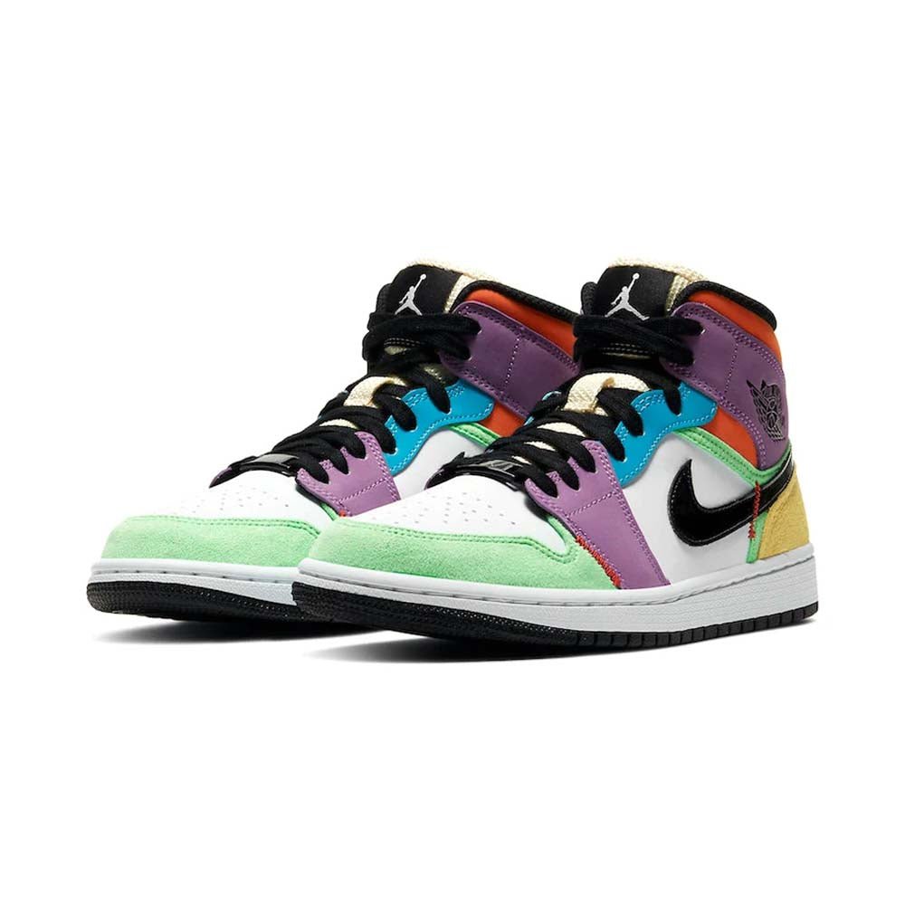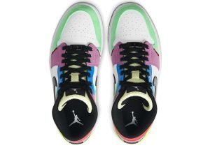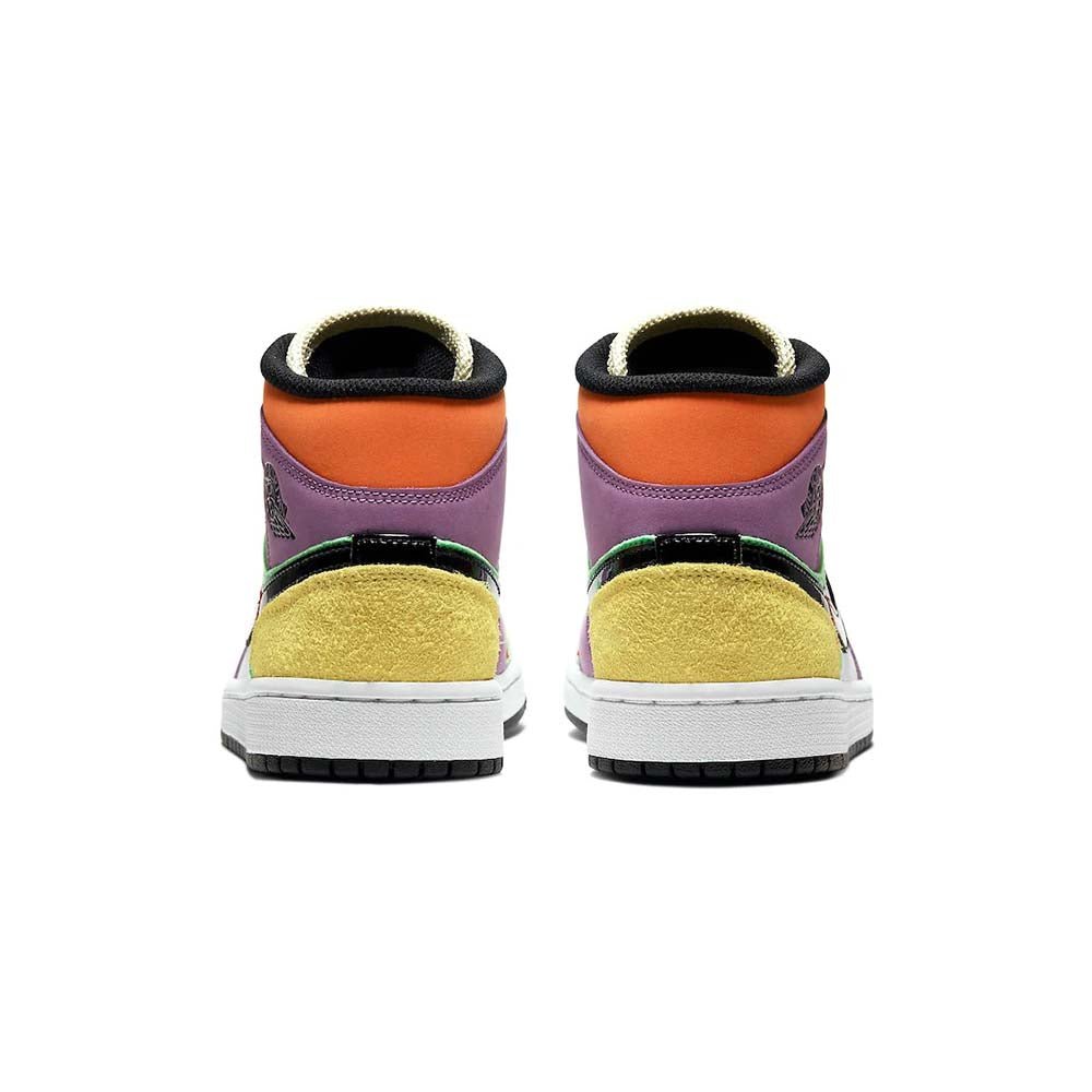 The women’s Air Jordan 1 Mid SE ‘Lightbulb’ showcases an array of mixed materials and hues on the upper. The design uses a white leather base, accented with patent leather detailing on the black Swoosh and blue eyestay. Suede paneling in green and yellow are applied to the toe and heel, while purple nubuck appears on the collar flap and forefoot overlay. Exposed zigzag stitching in contrasting red gives the shoe an unfinished look.