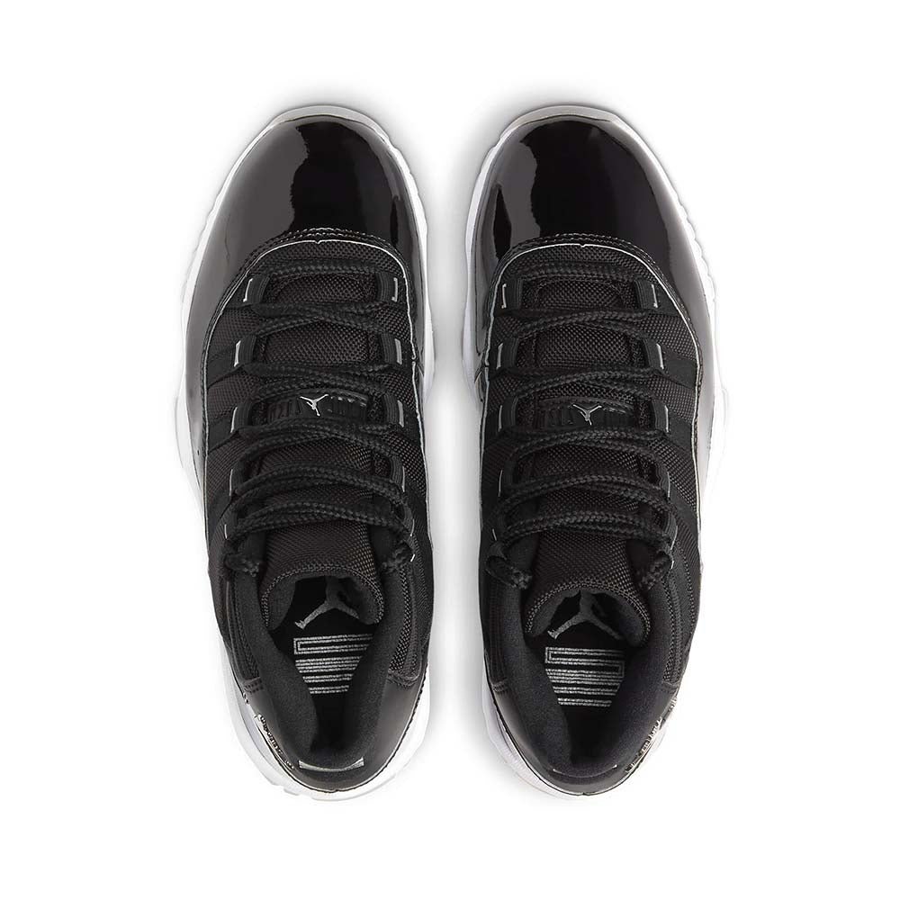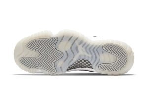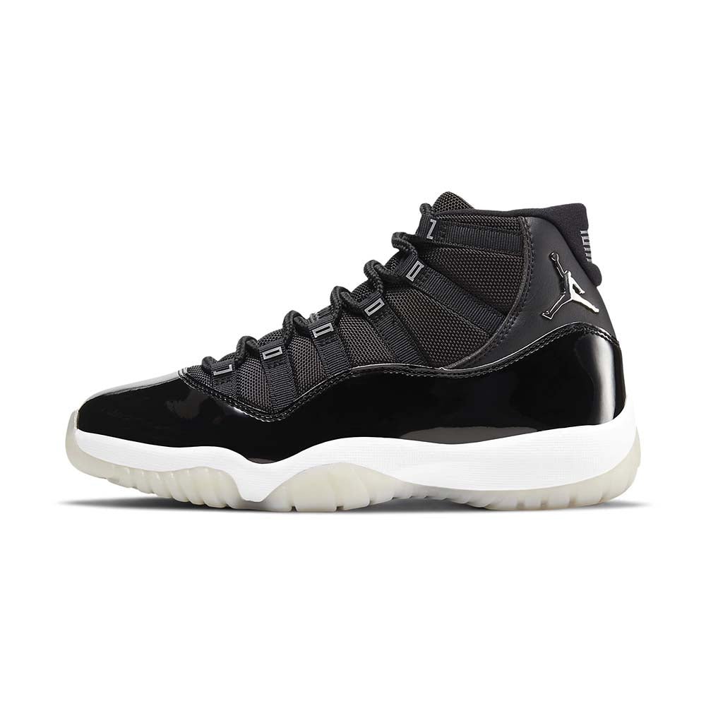 The Air Jordan 11 GS “Jubilee” is the youth sizing of the colorway that salutes the 25-year anniversary of Michael Jordan’s eleventh signature shoe. The “Jubilee” was released by Jordan Brand in Winter 2020 and is inspired by a concept sketched by Tinker Hatfield during his designing of the Air Jordan 11 in the mid ’90s. Elements of both the “Concord” and “Space Jam” colorways are combined into one on the “Jubilee” including a black patent leather mudguard, which is also culled from the “Bred” design. The word “Jordan” is spelled out in metallic silver text along the side of the eyelets in reference to the original sketch of the shoe by Hatfield. A silver Jumpman emblem can be found on the collar, and the traditional “23” on the back of the heel is also given the same silver treatment.