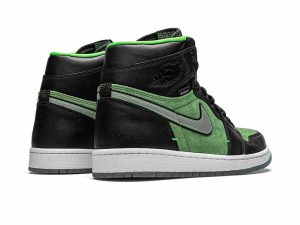 The Air Jordan 1 High Zoom “Zen Green” incorporates Zoom Air technology into the sole of Michael Jordan’s first signature shoe. The Jordan 1 Zoom model made its debut late in 2019 to much success. Now, Jordan Brand returns with this “Zen Green” design as part of its Summer 2020 release cycle, and the results are clearly as favorable. Hairy Zen Green suede dots the perforated toe and mid-panel. Supple black leather overlays can be found on the forefoot, eyelets, collar, and heel. A Silver Metallic Swoosh is located on the mid-panel and features contrasting green stitching. Tonal “Wings” detailing appears on the collar and a mini nylon Zoom tag can be found on the mid-panel beneath the collar. A vibrant neon green sock liner contrasts the black nylon tongue. As previously mentioned, Zoom Air cushioning is embedded within the sole to provide the wearer ample amounts of support.
