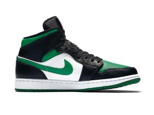 The Air Jordan 1 Mid “Green Toe” is part of Jordan Brand’s continuous efforts of creating ultra-wearable colorways of Michael Jordan’s first signature shoe in mid-top form. Premium leather highlights the upper as black leather overlays on the forefoot and eyelets is contrasted by a white leather base. Jordan Brand references classic Air Jordan 1 styling by equipping the shoe with a perforated green leather toe that contrasts the forefoot. Vibrant red Wings branding on the black collar finishes off the styling.