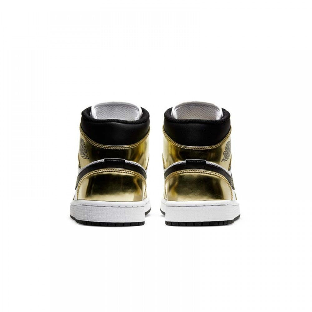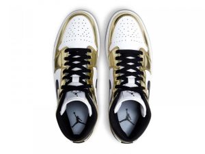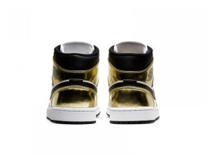 The Air Jordan 1 Mid SE ‘Metallic Gold’ treats the classic silhouette to a luxe makeover, highlighted by a white leather upper with metallic gold overlays and contrasting black hits on the Swoosh and collar. A Jumpman icon adorns the woven tongue tag, complementing a classic Wings logo stamped on the lateral collar flap. The mid-top rides on a traditional rubber cupsole, enhanced with encapsulated Nike Air cushioning in the heel.