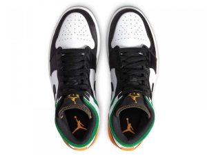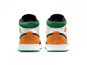Looking closer this mid-top Air Jordan 1 comes with White leather across the upper while Black nylon lands on the Swoosh and overlays. Green is then used on the ankle and rubber outsole while Yellow is applied to the tongue branding and zig-zag stitching. Finishing the look is Orange on the Wings and wraps the heel.