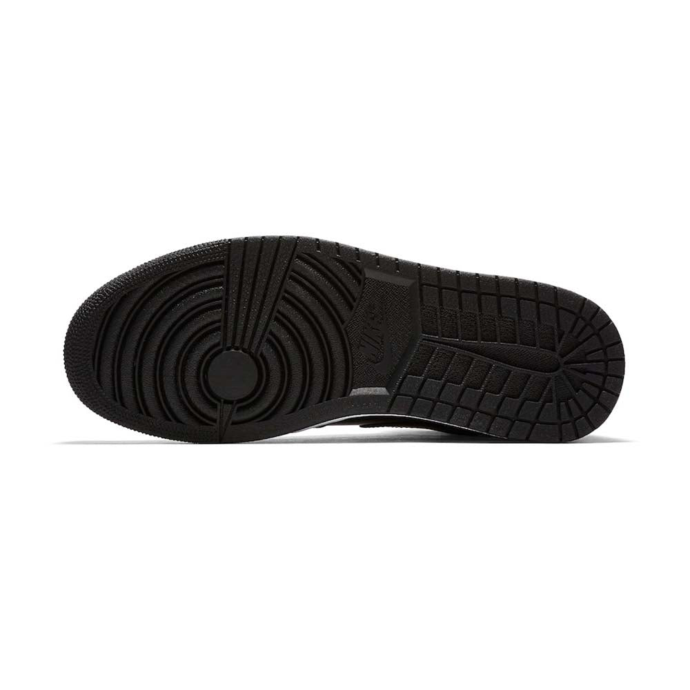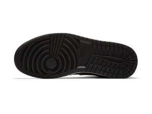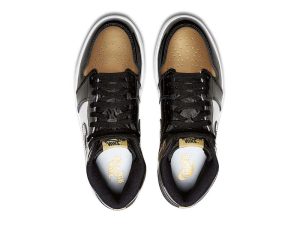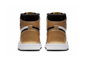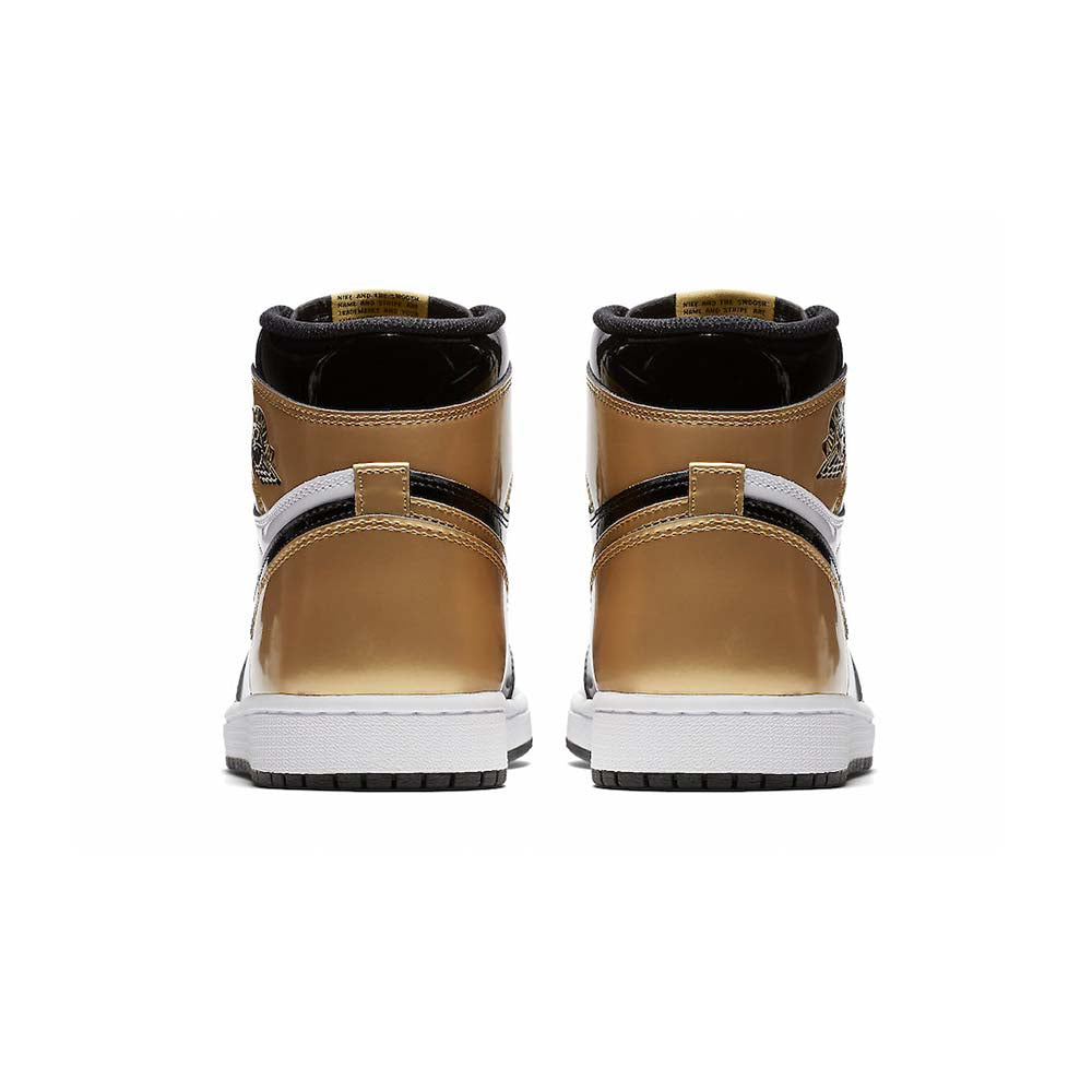The Air Jordan 1 Retro High OG NRG ‘Gold Toe’ features a black patent leather upper with distinctive metallic gold accents on the perforated toe box, tongue branding, and the heel panel. The high top also boasts a white side panel which extends from the midfoot to the heel, and a white rubber midsole. Other details include suede accents on the lacing structure, large Swoosh branding, and a tonal black outsole.
