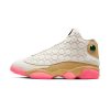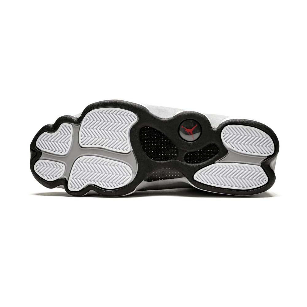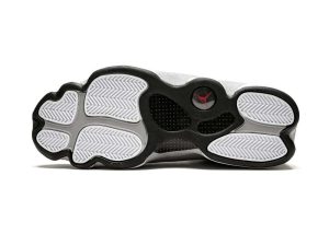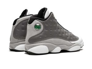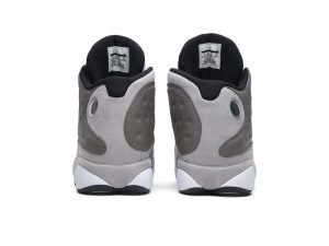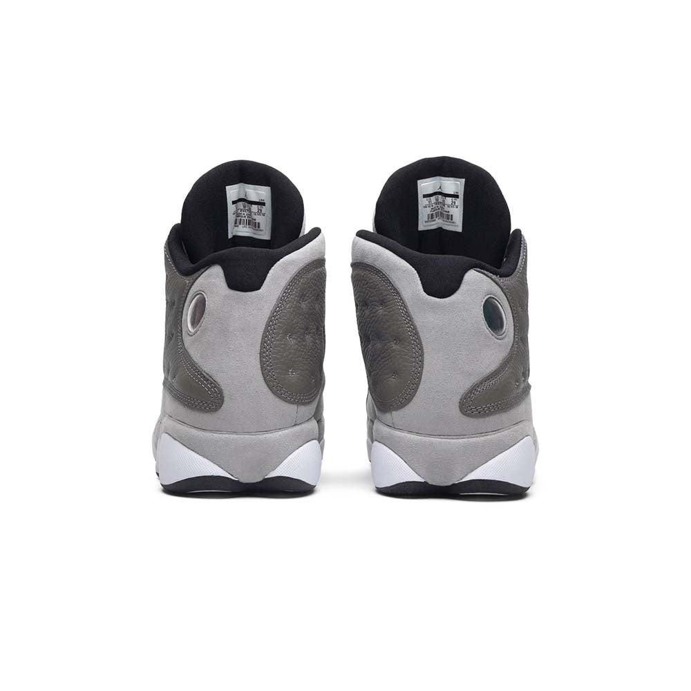The Air Jordan 13 Atmosphere Grey is one of the most versatile colorways of Michael Jordans legendary thirteenth signature shoe. The Jordan 13, which has been heralded for both its innovative performance aspects and stately appearance, was worn by Jordan during his last complete season with the Chicago Bulls in 1997-98. The upper features a dark grey dotted leather build that is contrasted by a light grey suede mudguard and midsole. A panthers eye holographic emblem dots the heel. Both the toe and perforated tongue are finished off in crisp white leather. Notable branding includes a black nylon Jordan tab on the toe and a black embroidered Jumpman on the tongue. The Air Jordan 13 Atmosphere Grey was released on March 23, 2019.
