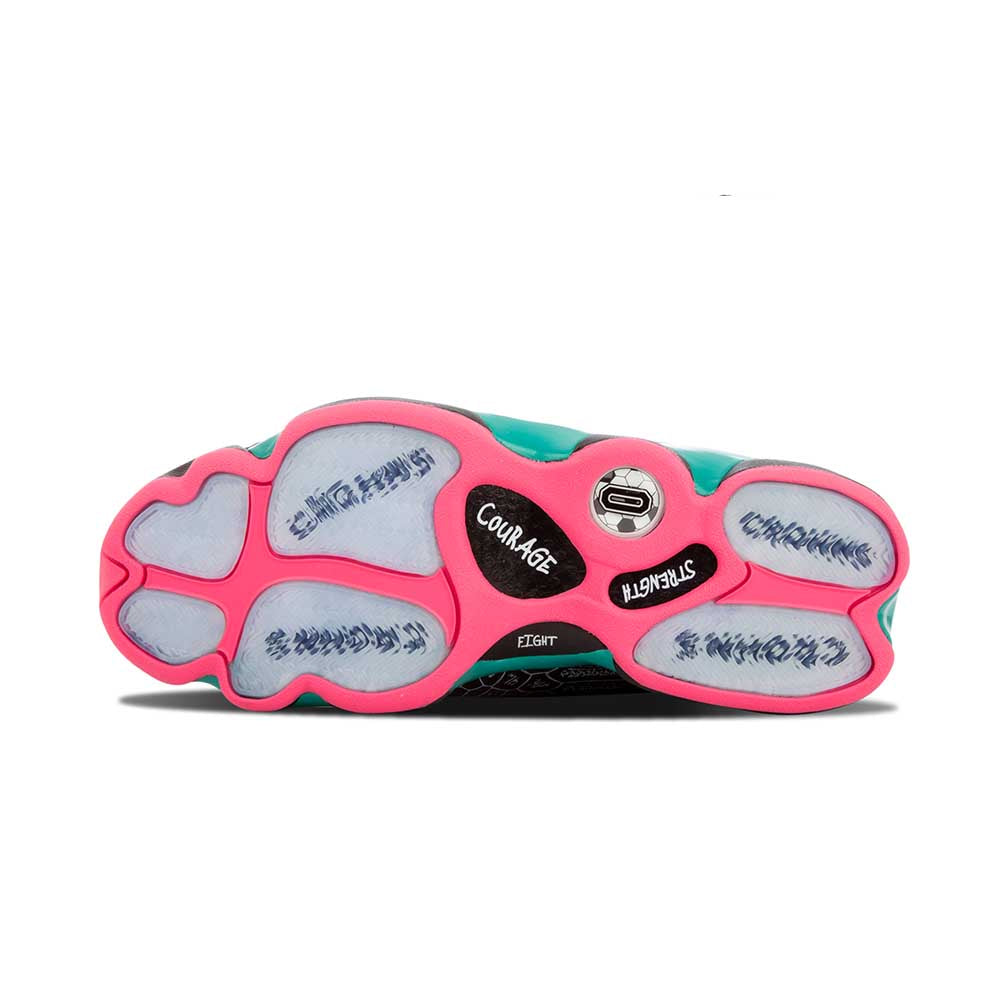 Designed by patient John Charles, the Air Jordan 13 gets its most distinct makeover ever. The bold design features a patent leather upper in snakeskin-embossed black and smooth green with details including his soccer number, initials, and “Crohn’s” written below the clear portions of the outsole, symbolic of John’s fight to stomp out the disease he suffers from.