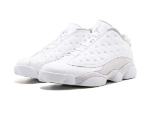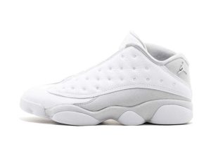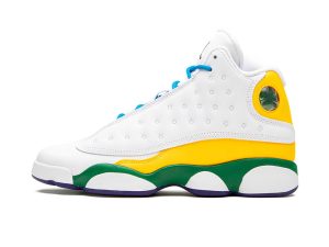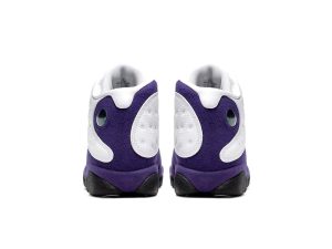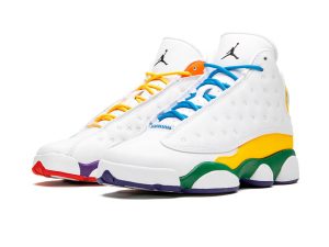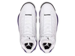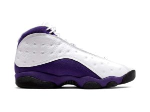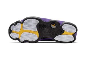 Emerging in July 2019 as part of a ‘Rivals’ series, the Air Jordan 13 Retro ‘Lakers’ sneaker looks back to the 1990-91 NBA Finals when Michael Jordan won his first championship ring against Los Angeles. This AJ13 sports a perforated leather upper with Lakers inspired colors incorporated on the heel, front-facing Jumpman and mudguard. Hints of gold appear on the outsole, between the herringbone pods.