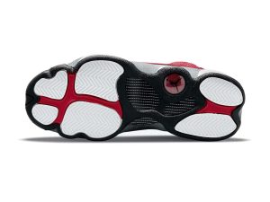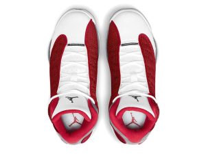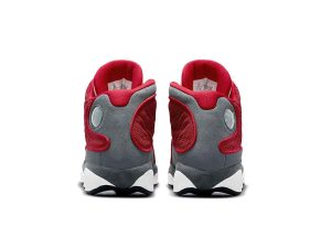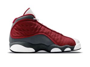 Dressed in a Gym Red, Flint Grey, White, and Black color scheme.This colorway was created initially for Kevin Martin during his days with Houston Rockets. The Air Jordan 13 “Red Flint” looks similar to Kevin Martin’s Jordan 13 PE featuring White leather on the toe, Red reflective mesh on the side panels and Flint Grey suede on the mudguards and heels.