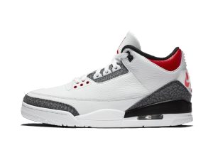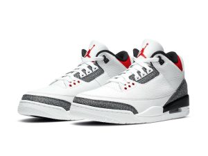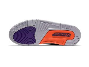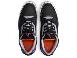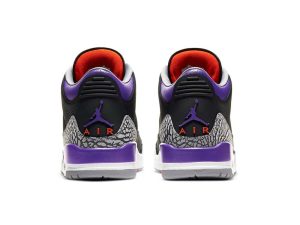 The Air Jordan 3 Retro ‘Court Purple’ makes use of a black tumbled leather upper with signature elephant print overlays at the toe and heel. Violet accents make their way to the padded collar, eyelets and two-tone midsole, featuring visible Air cushioning in the heel. Unexpected pops of vibrant orange stand out on the sneaker’s interior tongue and branding elements, highlighted by a raised Jumpman icon atop the tongue and heel.