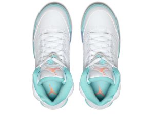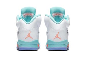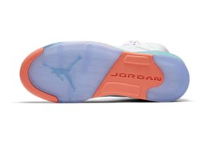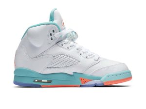 Released in July 2018, the Air Jordan 5 received this fresh new look appropriate for the summer season. The children’s Air Jordan 5 GS Light Aqua features a clean white upper with aqua accents on the midsole and inner lining, while bright orange detailing and icy clear blue portions of the outsole complete the refreshing color palette. The result is a decidedly tropical look. Produced only in childrens sizing, the appealing look of the Air Jordan 5 GS Light Aqua left many collectors wishing that they could get their own pair.