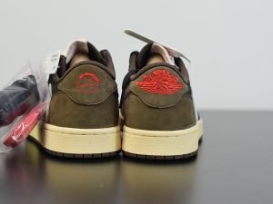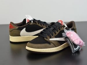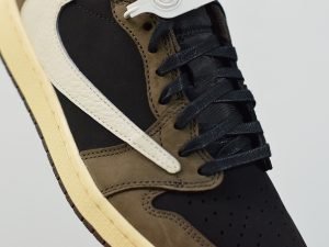 The Travis Scott x Air Jordan 1 Low is the low-top version of the world-famous rapper’s Jordan 1 collaboration. Following the standard high-top Jordan 1 from spring 2019, this Jordan 1 Low by Travis Scott released in July in very limited quantities and achieved the same hype and coveted status as the first design. Scott once again displayed his affinity for earthy tones while also utilizing the same backward Swoosh design as the initial high-top. The upper is constructed in premium nubuck with black and brown tones, while the large reversed Swoosh contrasts in white leather. Red highlights are found on the tongue tags and embroidered heel logos, while a Sail midsole completes the clean design.