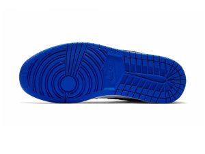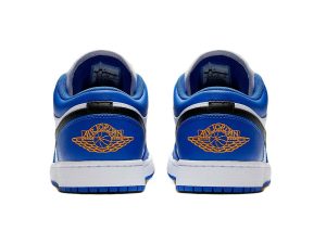 This offering of the low-top Air Jordan 1 features a White leather base with Blue overlays and Black covering the Swooshes and laces. Finishing off the design are Orange accents on the tongues, heels, and insoles atop a White midsole and Blue rubber outsole.