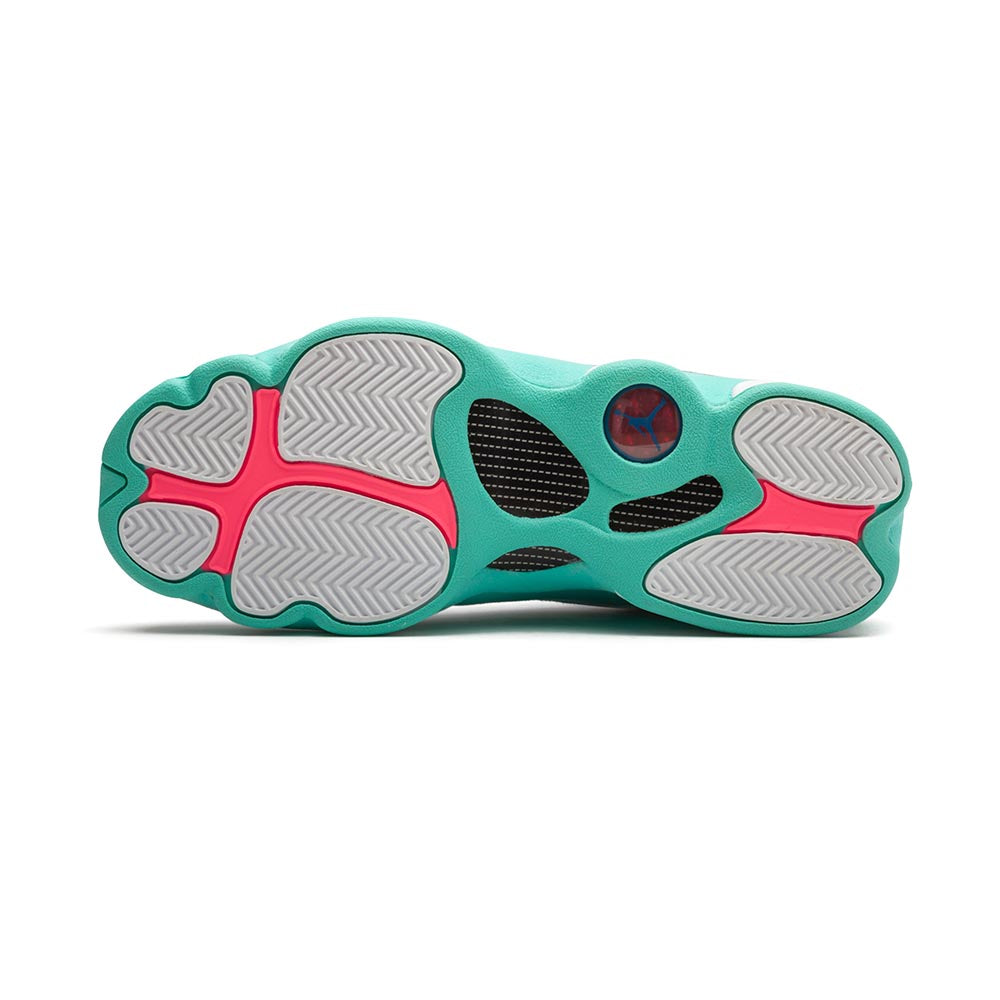 The Air Jordan 13 GS “Aurora Green” is a kids’ edition of Michael Jordan’s thirteenth signature shoe with a fresh design for the summer months. Lauded for its comfort both on and off the court, the Jordan 13 was worn by “His Airness” during his final season with the Chicago Bulls in 1997-98. This colorful take features a bright Aurora Green felt base with white leather paneling and pink, green, and blue stitching accents. An embroidered blue Jumpman covers the tongue while a pink Jordan Brand tab appears where the tongue connects to the toe. This Air Jordan 13 for kids swaps out the holographic “panther’s eye” emblem on the collar for an embroidered Jumpman logo with “23” branding. Colorful rope laces complete the fun design. The Air Jordan 13 GS “Aurora Green” was released on May 9, 2020.