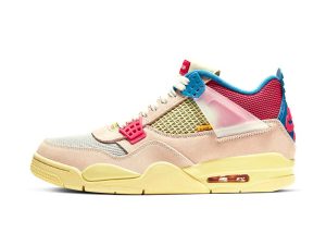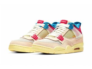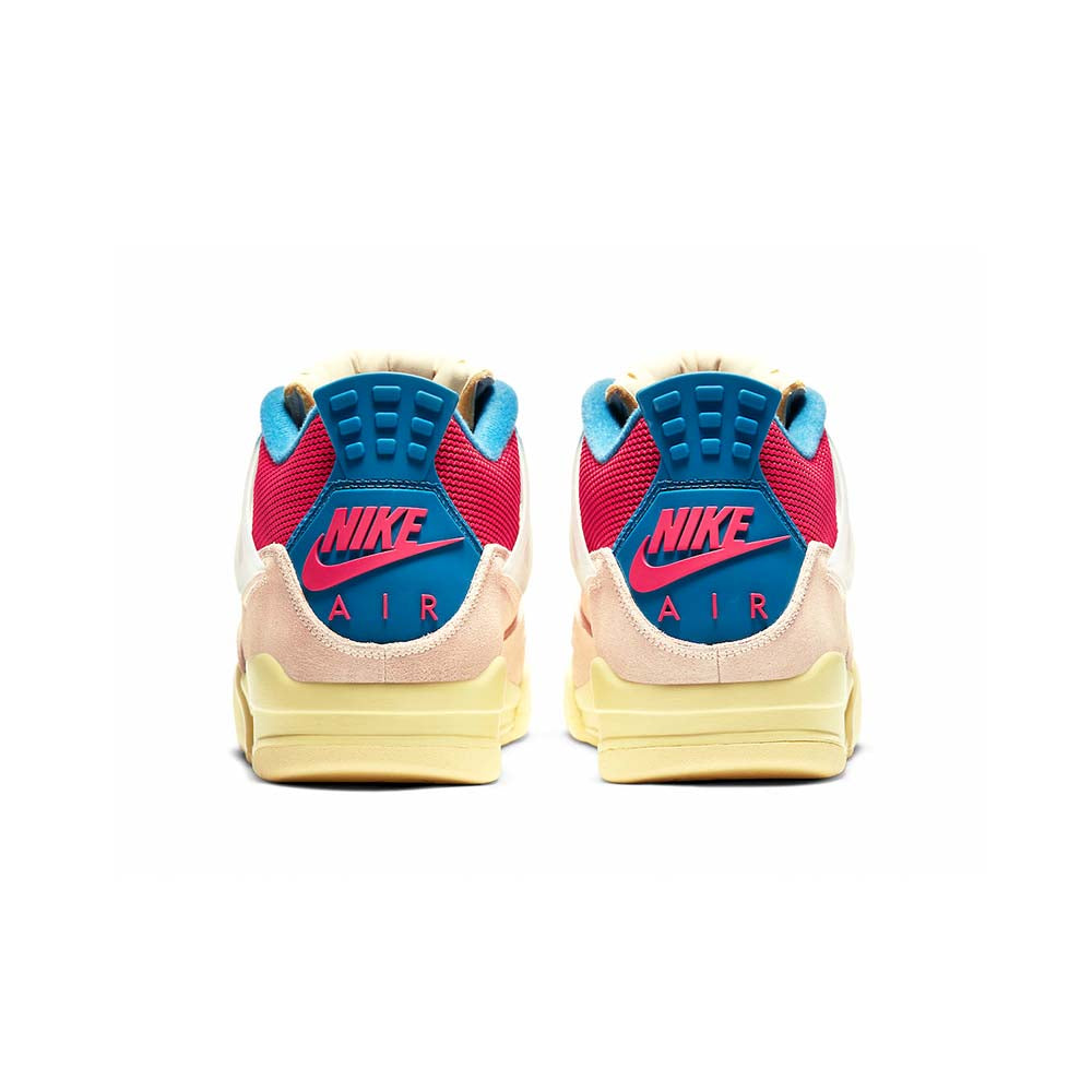 The Union x Air Jordan 4 “Guava Ice” is one of Summer 2020’s most coveted collaborations from Jordan Brand. Union, a Los Angeles streetwear, fashion, and lifestyle boutique, renewed its partnership with Jordan Brand following its monumental Air Jordan 1 collaboration from 2018 on two Jordan 4 colorways with a unique new construction. Beginning with the color scheme of “Guava Ice,” the upper features vintage-inspired yellow netting on the mid-panel and tongue. A sand colored brushed suede base appears on the mudguard, toe cap, and eyelets. White and red engineered mesh detailing dots the toe and collar, respectively. Pink plastic lace accenting clips and a translucent lace support clip add to the eccentric vibe of this shoe. A blue plastic heel clip with contrasting red “Nike Air” adds a classic touch to the decidedly contemporary look. The previously mentioned shortened tongue is actually folded over and stitched down per Union owner Chris Gibbs’ specifications. The wearer is able to remove the stitching to obtain a traditional Air Jordan 4 look.