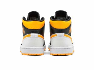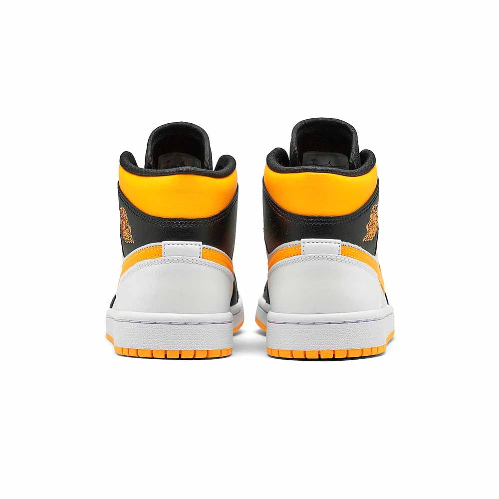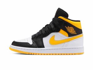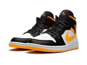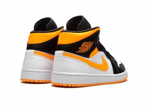 The women’s Air Jordan 1 Mid SE ‘White Laser Orange’ features unconventional color blocking on the classic silhouette. The sneaker’s white leather base is contrasted by black leather on the forefoot overlay, eyestay and collar flap, stamped with the Wings logo in Laser Orange. The same citrus hue is repeated on the padded collar, Swoosh and rubber outsole. Waxed flat laces give the shoe a premium touch.