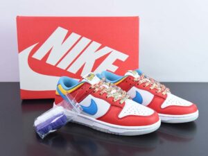 The Nike Dunk Low QS LeBron James Fruity Pebbles come in Habanero Red mixed with Laser Blue and White colorway.