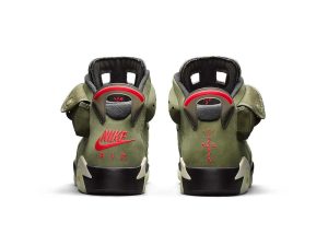 The Travis Scott x Air Jordan 6 Retro ‘Olive’ represents a collaboration between the Houston based rapper and Jordan Brand. This take on the AJ 6, which Scott debuted while performing during halftime of Super Bowl 53, released in October 2019. It features a Medium Olive, black, Sail and University Red colorway along with several unique elements: a small pocket with a snap on the collar, a nubuck and suede upper, Scott’s ‘Cactus Jack’ logo on the heel and a glow-in-the-dark translucent outsole.