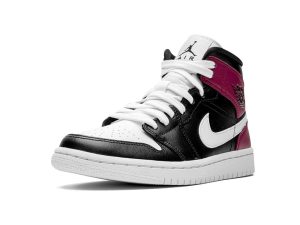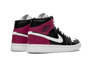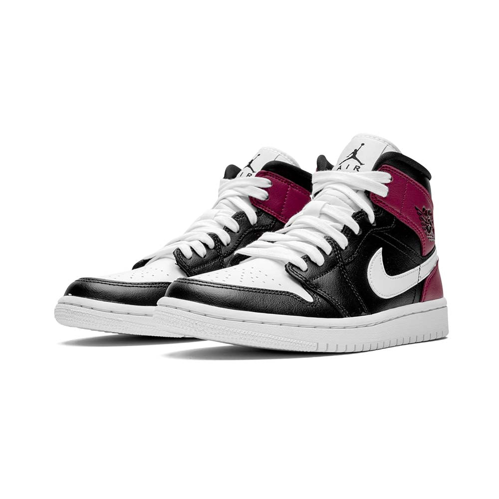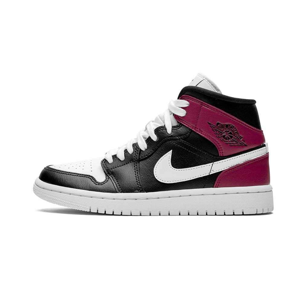 This offering of the mid-top Air Jordan 1 features White leather on the toe and Swoosh with Black leather overlays on the toe, side panels and upper collar. Noble Red is used around the heel completed with a solid White rubber sole.