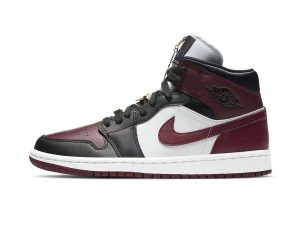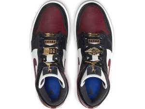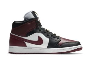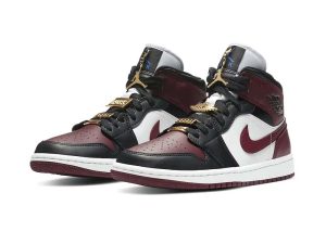 The women’s Air Jordan 1 Mid SE ‘Gold Pendants’ enlivens the classic silhouette with metallic gold hardware. The decorative pieces take the form of a gold Jumpman pendant and various matching gold lace jewels, including the familiar Wings logo and rectangular plates stamped with ‘1985’ and ‘Women.’ The shoe itself features a full leather build, highlighted by white and burgundy paneling with contrasting black overlays along the toe and eyestay. A royal blue Jumpman adorns the woven tongue tag.