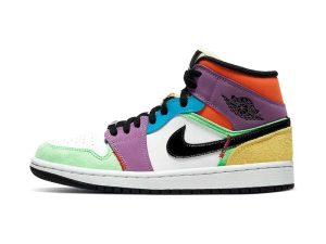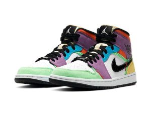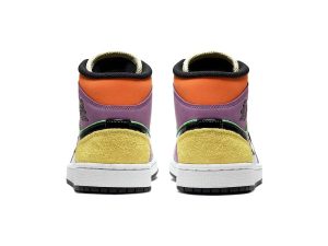 The women’s Air Jordan 1 Mid SE ‘Lightbulb’ showcases an array of mixed materials and hues on the upper. The design uses a white leather base, accented with patent leather detailing on the black Swoosh and blue eyestay. Suede paneling in green and yellow are applied to the toe and heel, while purple nubuck appears on the collar flap and forefoot overlay. Exposed zigzag stitching in contrasting red gives the shoe an unfinished look.