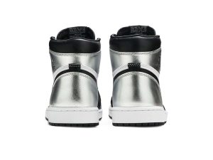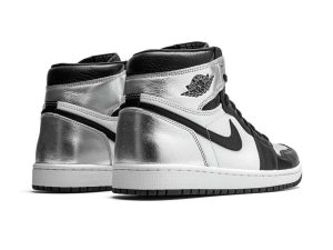 The women’s Air Jordan 1 Retro High OG ‘Silver Toe’ adopts color blocking that recalls the Air Jordan 1 ‘Gold Toe’ from 2018. This pair discards the patent leather build of the older shoe in favor of a standard leather upper, featuring a clean white base with contrasting black forefoot overlays. A shiny metallic silver finish distinguishes the toe box, heel panel and collar flap, the latter stamped with a Jordan Wings logo on the lateral side. Additional branding elements include a black leather Swoosh and a woven Nike tag atop the nylon tongue.