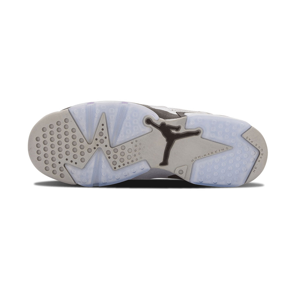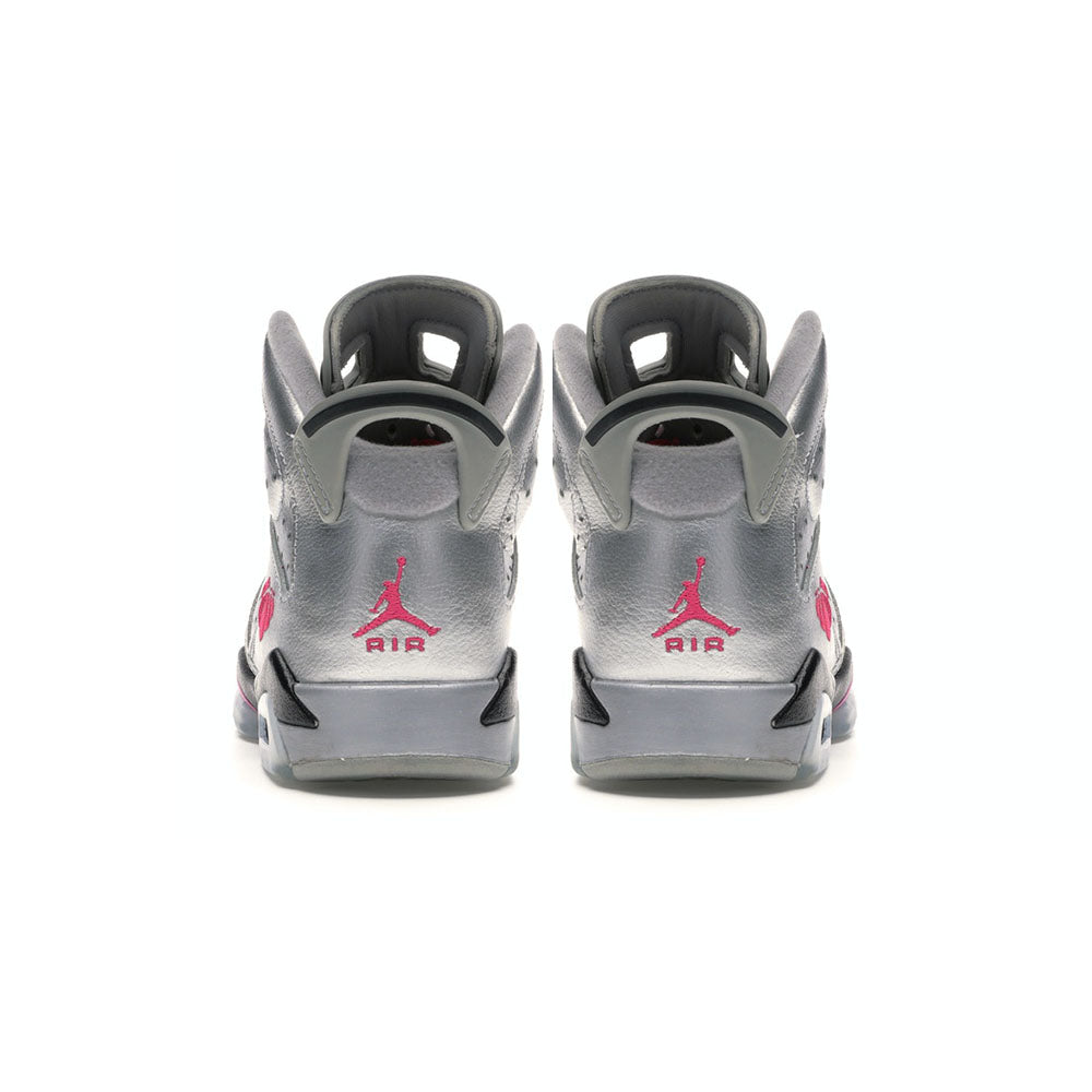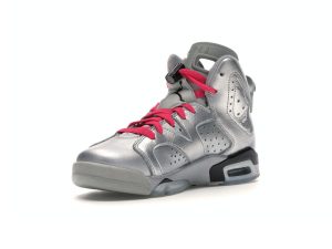 The Air Jordan 6 Retro GG ‘Valentine’s Day’ is an all-silver take on the classic kick. Released in women’s sizing, the shoe features pink and black hits around the body of the shoe, pink laces, an embroidered heart and basketball logo, and a matching pink Jumpman logo on the heel.