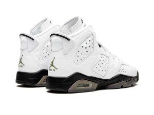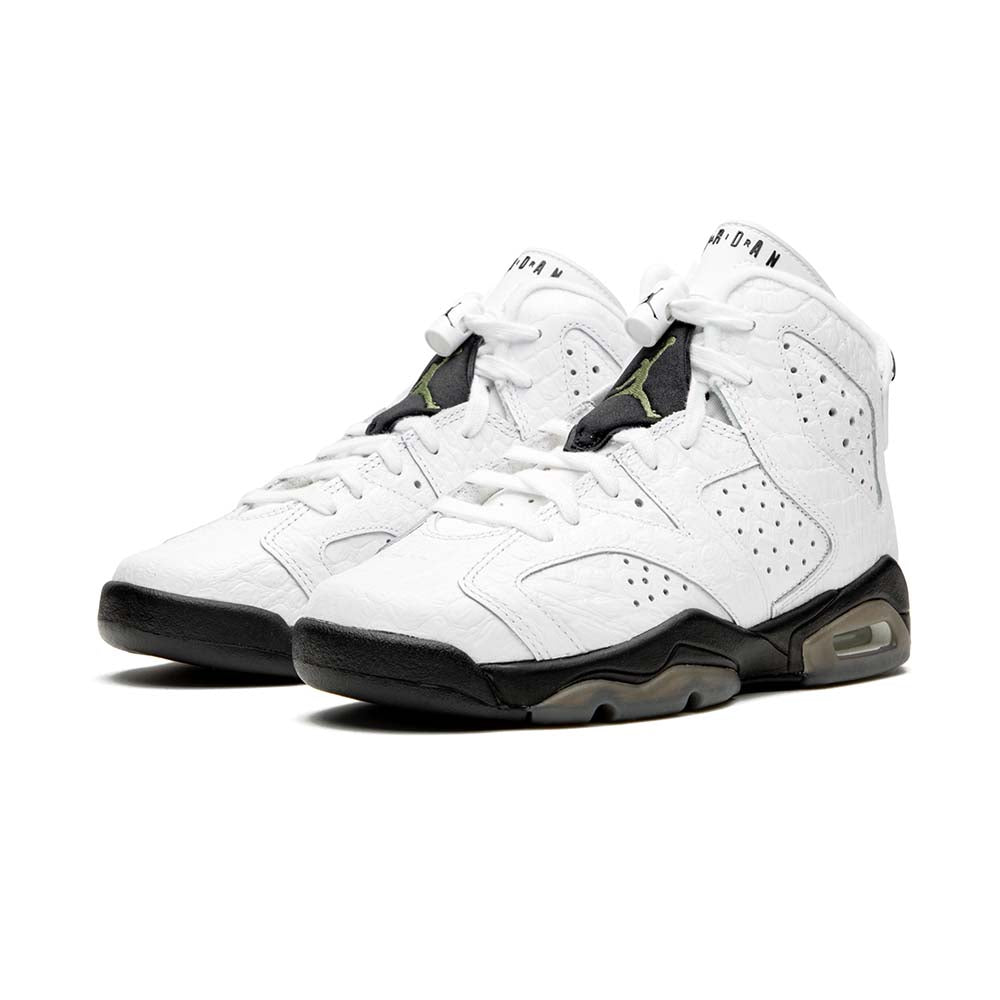 The Air Jordan 6 GS “Alligator” is the youth sizing of this high-fashion-inspired colorway of the iconic ’90s basketball sneaker. Michael Jordan’s sixth signature model receives a dose of opulence as it outfits the entire upper in white gator-textured leather. Perforations on the forefoot, mid-panel, and collar provide contrast. A black nylon patch covering the laces features olive Jumpman branding and classic “Air Jordan” detailing appears on the tongue. Embroidered olive Jumpman detailing on the heel and a black midsole with visible Air cushioning in the heel finish off the look.